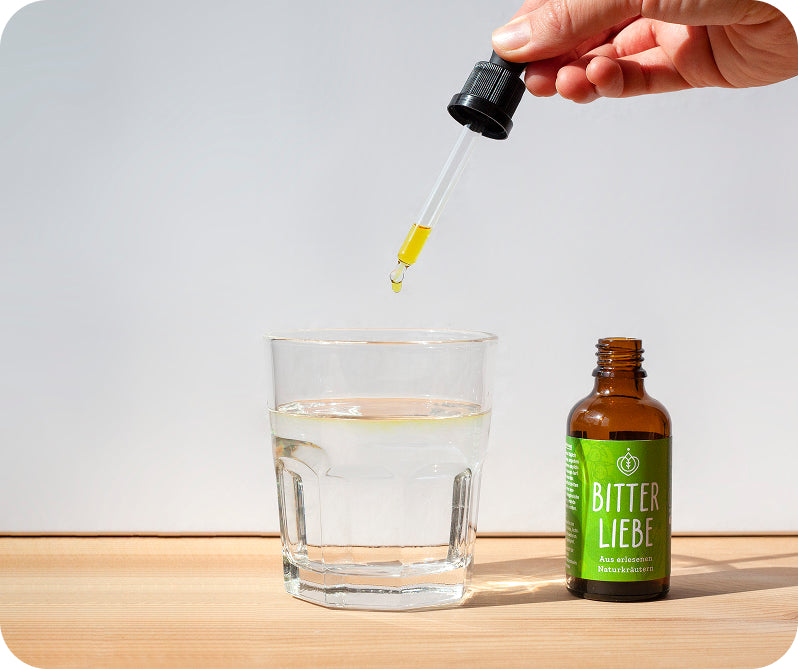 Einfach 25 Tropfen (halbe Pipette) direkt auf die Zunge geben und kurz im Mund behalten, bevor Du sie herunterschluckst. So können die Bitterstoffe ihren vollen Geschmack entfalten. Falls Dir das zu bitter ist, kannst Du sie gerne mit etwas Wasser verdünnen.Und keine Sorge, bei regelmäßiger Einnahme gewöhnst Du Dich ganz schnell an den Geschmack.